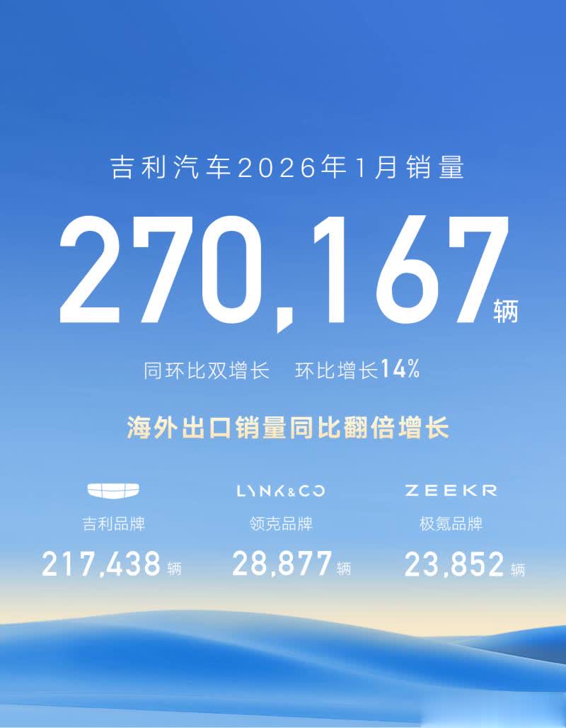 吉利汽车1月销量270,167辆,环比增长14%,其中新能源销量124,252辆,同比增长3%;1月海外出口60,506辆,同比增长121%,具体到品牌方面,吉利品牌1月销量217,438辆;领克品牌1月销量28,877辆;极氪品牌1月销量23852辆。从数据来看,吉利无疑是最大赢家,今年也是吉利的产品大年,包括极氪8X、吉利银河M7、领克800、领克07 EM-P旅行版、吉利银河战舰等。