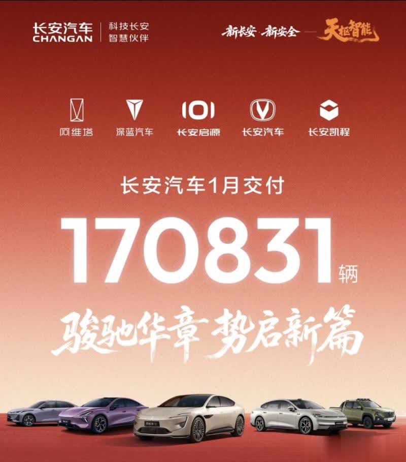 长安汽车1月交付170,831辆新车,不过旗下品牌具体销量并未公布,不过可以知道的是深蓝S05上市以来累计销量超17万辆,月均销量过万;长安启源A06上市累计交付超2.1万辆;长安CS75系列累计销量超300万辆;长安逸动连续11个月销量过万。